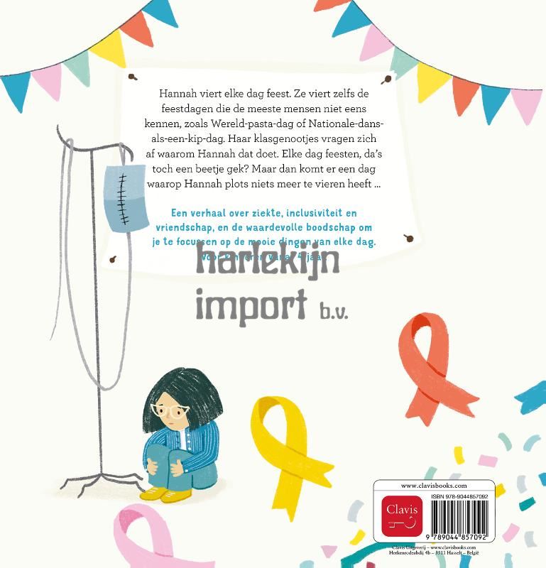Hannah viert elke dag feest. Ze viert zelfs de feestdagen die de meeste mensen niet eens kennen, zoals Wereld-pasta-dag of Nationale-dans-als-een-kip-dag. Haar klasgenootjes vragen zich af waarom Hannah dat doet. Elke dag feesten, da’s toch een beetje gek? Maar dan komt er een dag waarop Hannah plots niets meer te vieren heeft … Een verhaal over ziekte, inclusiviteit en vriendschap, en de waardevolle boodschap om je te focussen op de mooie dingen van elke dag. Voor kinderen vanaf 4 jaar.