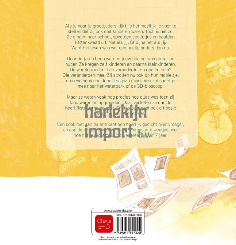 Als je naar je grootouders kijkt, is het moeilijk je voor te stellen dat zij ook ooit kinderen waren. Toch is het zo. Ze gingen naar school, speelden spelletjes en haalden kattenkwaad uit. Net als jij. Of bijna net als jij. Want het leven was wel een beetje anders dan nu. Door de jaren heen werden jouw opa en oma groter en ouder. Ze kregen zelf kinderen en daarna kleinkinderen. De wereld rondom hen veranderde. En opa en oma? Die veranderden mee. Zij scrollen nu ook op hun mobieltje, eten weleens een donut en gaan misschien zelfs met je mee naar het waterpark of de 3D-bioscoop. Maar ze weten vaak nog precies hoe alles was toen zij kind waren en opgroeiden. Daar vertellen ze dan de heerlijkste verhalen over. En daarover gaat ook dit boek: over hoe het vroeger was. Een boek met aan de ene kant een heerlijk gedicht over vroeger, en aan de andere kant heel veel interessante weetjes over hoe het nu écht zat. Voor iedereen vanaf 7 jaar.
