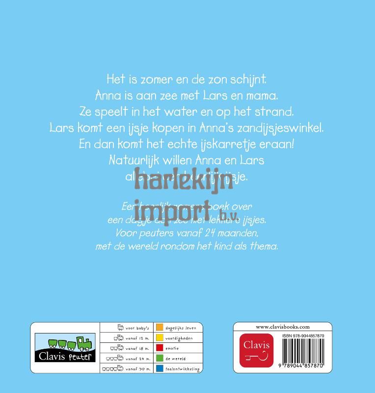 Het is zomer en de zon schijnt. Anna is aan zee met Lars en mama. Ze speelt in het water en op het strand. Lars komt een ijsje kopen in Anna’s zandijsjeswinkel. En dan komt het echte ijskarretje eraan! Natuurlijk willen Anna en Lars allebei een heerlijk ijsje. Een heerlijk zomers boek over een dagje aan zee met lekkere ijsjes. Voor peuters vanaf 24 maanden, met de wereld rondom het kind als thema.