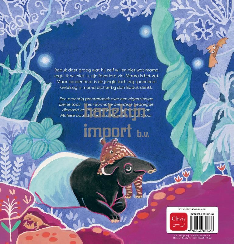 Baduk doet graag wat hij zelf wil en niet wat mama zegt. ‘Ik wil niet’ is zijn favoriete zin. Mama is het zat. Maar zonder haar is de jungle toch erg spannend! Gelukkig is mama dichterbij dan Baduk denkt. Een prachtig prentenboek over een eigenzinnige kleine tapir. Met informatie over deze bedreigde diersoort en unieke illustraties geïnspireerd op Maleise batikstoffen. Voor kinderen vanaf 5 jaar.