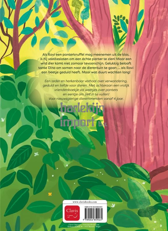 Als Ravi een panterknuffel mag meenemen uit de klas, is hij vastbesloten om een échte panter te zien! Maar een wild dier vind je niet zomaar. Gelukkig belooft tante Dina om samen naar de dierentuin te gaan … als Ravi een beetje geduld heeft. Maar wat duurt wachten lang! Een teder en herkenbaar verhaal over verwondering, geduld en liefde voor dieren. Met achteraan een vrolijk vriendenboekje vol weetjes over panters en eentje om zelf in te vullen! Voor nieuwsgierige dierenvrienden vanaf 4 jaar.