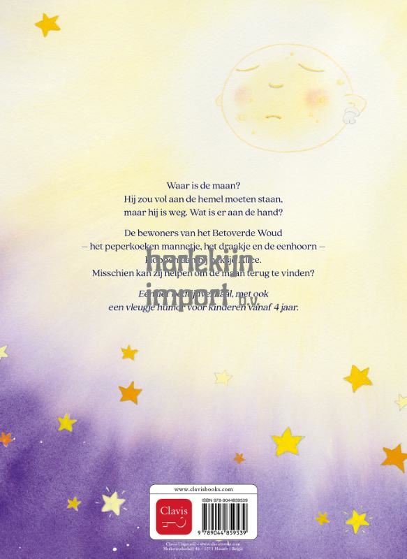 Waar is de maan? Hij zou vol aan de hemel moeten staan, maar hij is weg. De bewoners van het Betoverde Woud – het peperkoeken mannetje, het draakje en de eenhoorn – kloppen aan bij heksje Alice. Misschien kan zij helpen om de maan terug te vinden? Een lief en geruststellend bedtijdverhaal, met ook een vleugje humor. Een poëtisch boek voor kinderen vanaf 4 jaar.