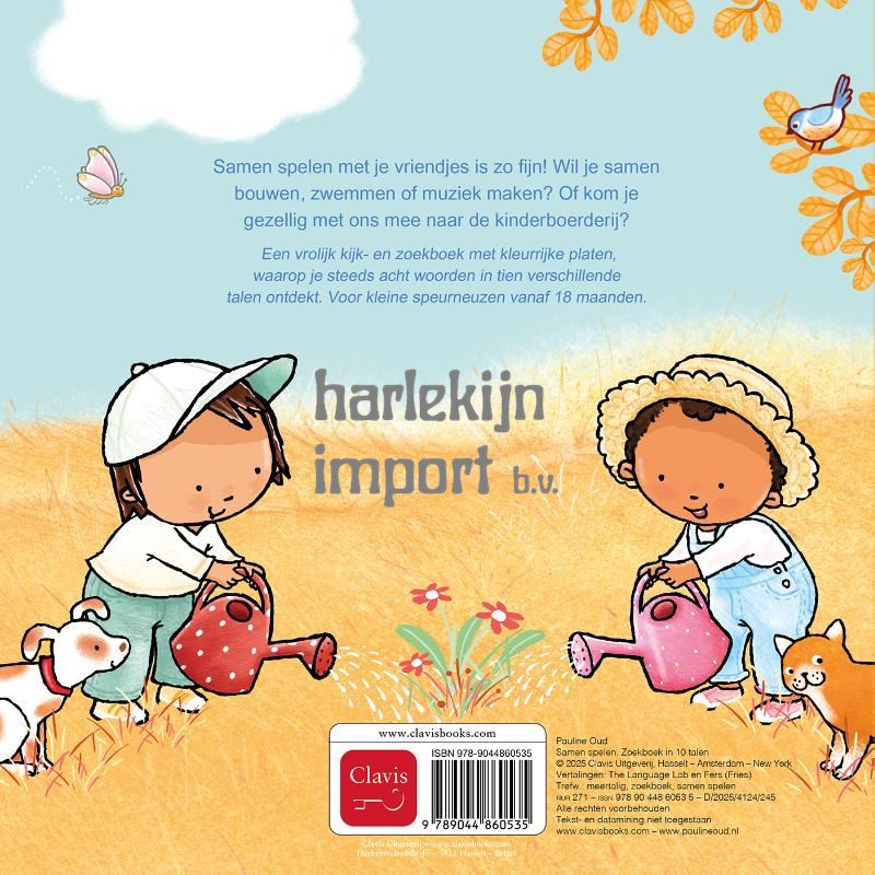 Samen spelen met je vriendjes is zo fijn! Wil je samen bouwen, zwemmen of muziek maken? Of kom je gezellig met ons mee naar de kinderboerderij? Een vrolijk kijk- en zoekboek met kleurrijke platen, waarop je steeds acht woorden in tien verschillende talen ontdekt. Voor kleine speurneuzen vanaf 18 maanden.