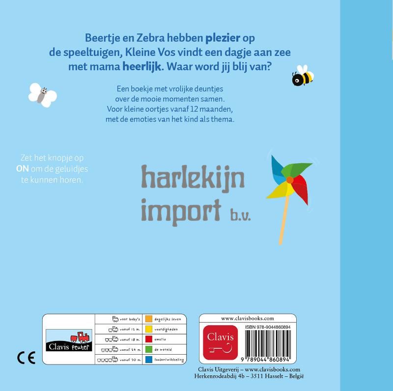 Beertje en Zebra hebben plezier op de speeltuigen, Kleine Vos vindt een dagje aan zee met mama heerlijk. Waar word jij blij van? Een boekje met vrolijke deuntjes over de mooie momenten samen. Voor kleine oortjes vanaf 12 maanden, met de emoties van het kind als thema.
