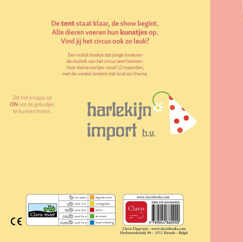 De tent staat klaar, de show begint. Alle dieren voeren hun kunstjes op. Vind jij het circus ook zo leuk? Een vrolijk boekje dat jonge kinderen de muziekjes van het circus leert kennen. Voor kleine oortjes vanaf 12 maanden, met de wereld rondom het kind als thema.