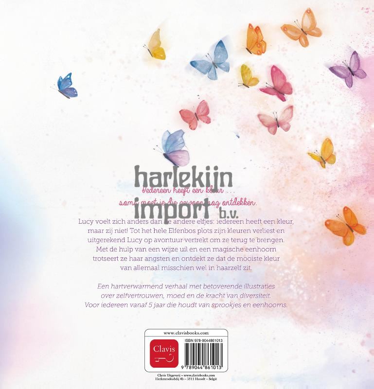 Iedereen heeft een kleur, soms moet je die gewoon nog ontdekken. [mag ergens mooi op de cover] Lucy voelt zich anders dan de andere elfjes: zij heeft geen kleur. Maar wanneer het Elfenbos plots zijn kleuren verliest, is het uitgerekend Lucy die op avontuur trekt om ze terug te brengen. Met de hulp van een wijze uil en een magische eenhoorn trotseert ze haar angsten en ontdekt ze dat de mooiste kleur van allemaal misschien wel in haarzelf zit. Een hartverwarmend verhaal met betoverende illustraties over zelfvertrouwen, moed en de kracht van diversiteit. Voor iedereen vanaf 5 jaar die houdt van sprookjes en eenhoorns.