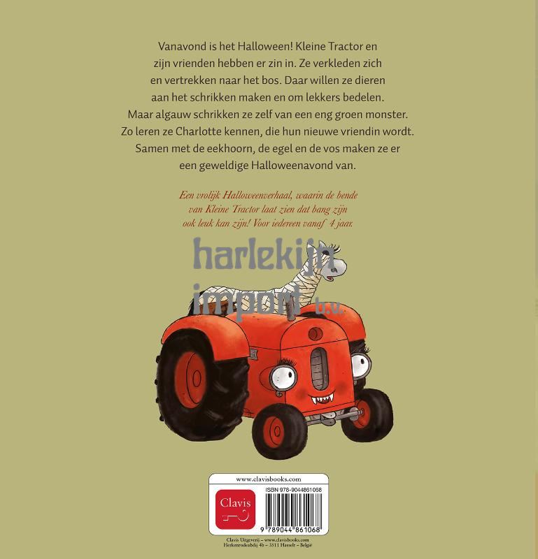 Vanavond is het Halloween! Kleine Tractor en zijn vrienden hebben er zin in. Ze verkleden zich en vertrekken naar het bos. Daar willen ze dieren aan het schrikken maken en om lekkers bedelen. Maar algauw schrikken ze zelf van een eng groen monster. Zo leren ze Charlotte kennen, die hun nieuwe vriendin wordt. Samen met de eekhoorn, de egel en de vos maken ze er een geweldige Halloweenavond van. Een vrolijk Halloweenverhaal, waarin de bende van Kleine Tractor laat zien dat bang zijn ook leuk kan zijn! Voor iedereen vanaf 4 jaar.