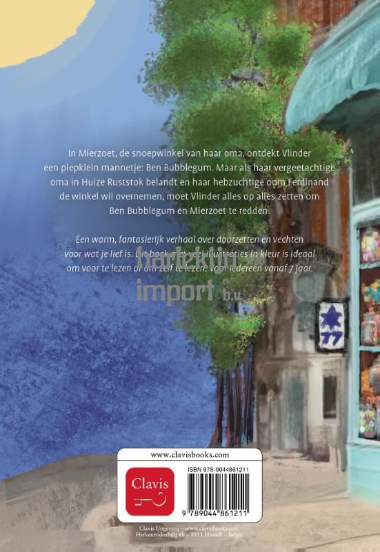 In Mierzoet, de snoepwinkel van haar oma, ontdekt Vlinder een piepklein mannetje: Ben Bubblegum. Maar als haar vergeetachtige oma in Huize Ruststok belandt en haar hebzuchtige oom Ferdinand de winkel wil overnemen, moet Vlinder alles op alles zetten om Ben Bubblegum en Mierzoet te redden. Een warm, fantasierijk verhaal over doorzetten en vechten voor wat je lief is. Dit boek met veel illustraties in kleur is ideaal om voor te lezen of om zelf te lezen. Voor iedereen vanaf 7 jaar.