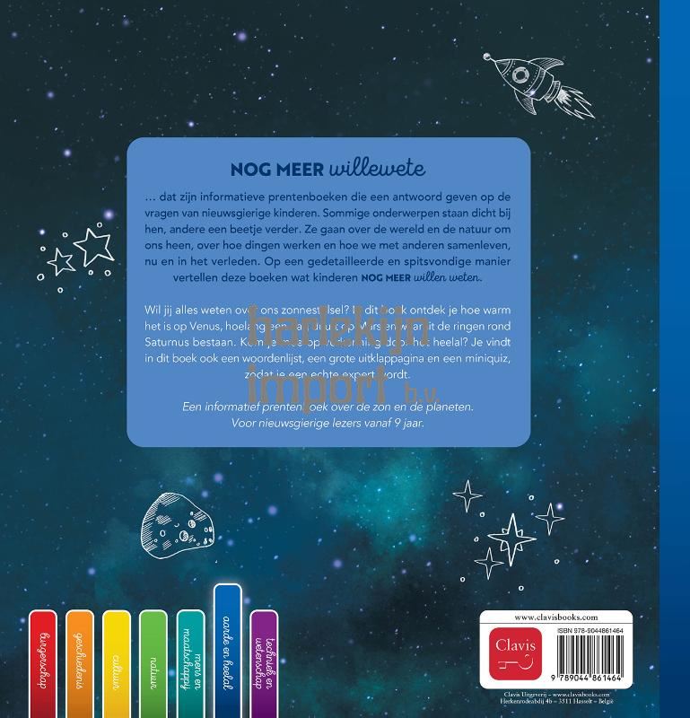 Nogmeerwillewete … dat zijn informatieve prentenboeken die een antwoord geven op de vragen van al iets oudere kinderen. Sommige onderwerpen staan dicht bij hen, andere een beetje verder. Ze gaan over de wereld en de natuur om ons heen, over het leven in het verleden en het leven nu. Op een speelse en spitsvondige manier vertellen deze boeken wat kinderen graag willen weten. Wil jij alles weten over ons zonnestelsel? In dit boek ontdek je hoe warm het is op Venus, hoelang een dag duurt op Mars en waaruit de ringen rond Saturnus bestaan. Kom je mee op verkenning door het heelal? Je vindt in dit boek ook een leuke strip, een grote uitklappagina en een miniquiz, zodat je een echte expert wordt. Een informatief prentenboek over de zon en de planeten. Voor nieuwsgierige kinderen vanaf 9 jaar.