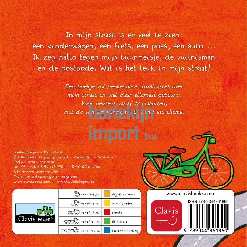 In mijn straat is er veel te zien: een kinderwagen, een fiets, een poes, een auto … Ik zeg hallo tegen mijn buurmeisje, de vuilnisman en de postbode. Wat is het leuk in mijn straat! Een boekje vol herkenbare illustraties over mijn straat en wat daar allemaal gebeurt. Voor peuters vanaf 12 maanden, met de wereld rondom het kind als thema.