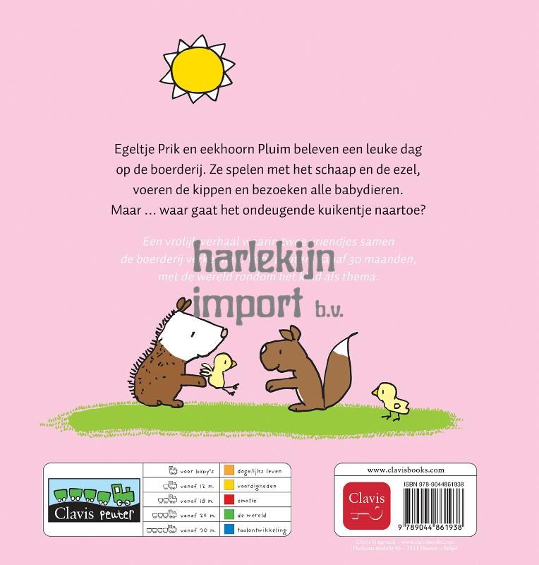Boooeee! Egeltje Prik en eekhoorn Pluim beleven een leuke dag op de boerderij. Ze spelen met het schaap en de ezel, voederen de kippen en bezoeken alle babydieren. Maar … waar gaat het ondeugende kuikentje naartoe? Een vrolijk verhaal waarin twee vriendjes samen de boerderij verkennen. Voor peuters vanaf 30 maanden, met de wereld rondom het kind als thema.