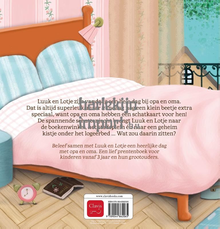 Luuk en Lotje zijn vandaag een hele dag bij opa en oma. Dat is altijd superleuk, maar vandaag nog een klein beetje extra speciaal, want opa en oma hebben een schatkaart voor hen! De spannende schattenjacht brengt Luuk en Lotje naar de boekenwinkel, het stadsplein én naar een geheim kistje onder het logeerbed … Wat zou daarin zitten? Beleef samen met Luuk en Lotje een heerlijke dag met opa en oma. Een lief prentenboek voor kinderen vanaf 3 jaar en hun grootouders.
