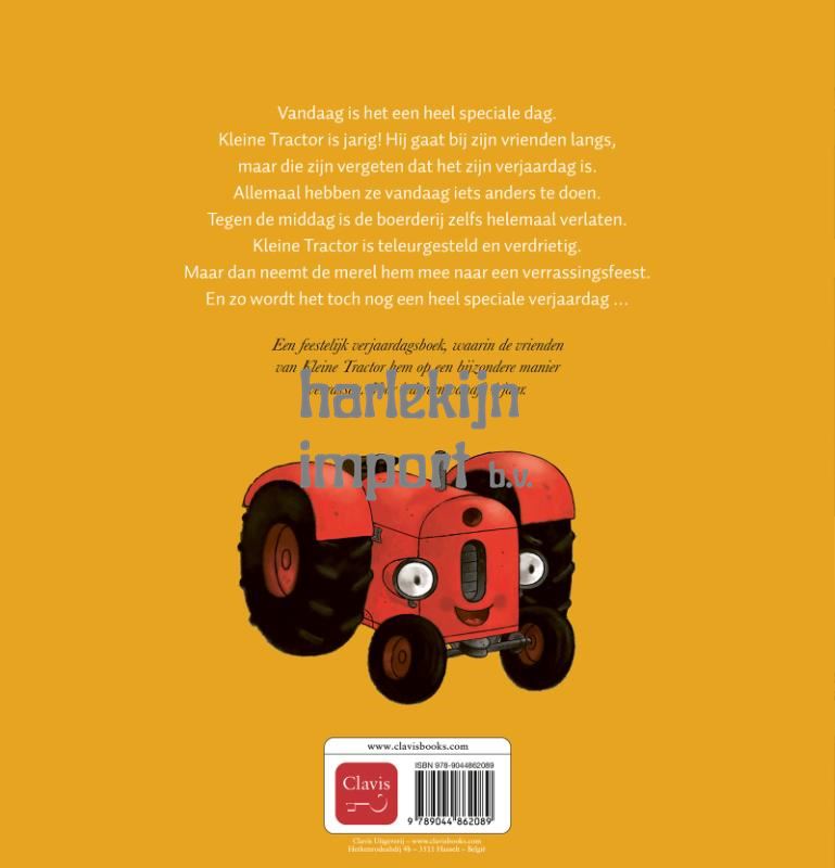 Vandaag is het een heel speciale dag. Kleine Tractor is jarig! Hij gaat bij zijn vrienden langs, maar die zijn vergeten dat het zijn verjaardag is. Allemaal hebben ze vandaag iets anders te doen. Tegen de middag is de boerderij zelfs helemaal verlaten. Kleine Tractor is teleurgesteld en verdrietig. Maar dan neemt de merel hem mee naar een verrassingsfeest. En zo wordt het toch nog een heel speciale verjaardag … Een feestelijk verjaardagsboek, waarin de vrienden van Kleine Tractor hem op een bijzondere manier verrassen. Voor iedereen vanaf 4 jaar.