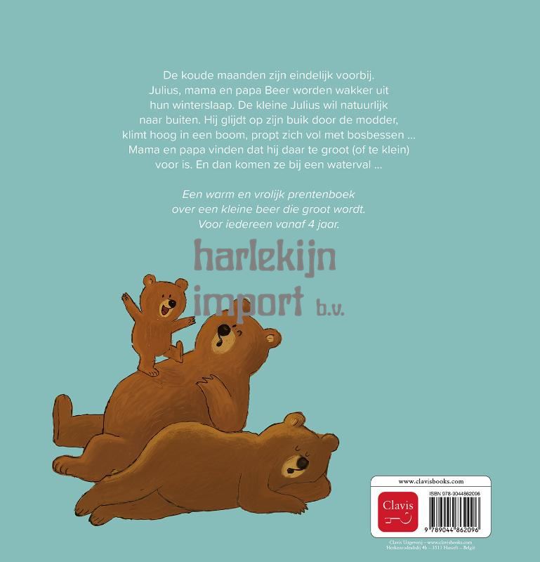 De koude maanden zijn eindelijk voorbij. Julius, mama en papa Beer worden wakker uit hun winterslaap. De kleine Julius wil natuurlijk naar buiten. Hij glijdt op zijn buik door de modder, klimt hoog in een boom, propt zich vol met bosbessen … Mama en papa vinden dat hij daar te groot (of te klein) voor is. En dan komen ze bij een waterval … Een warm en vrolijk prentenboek over een kleine beer die groot wordt. Voor iedereen vanaf 4 jaar.