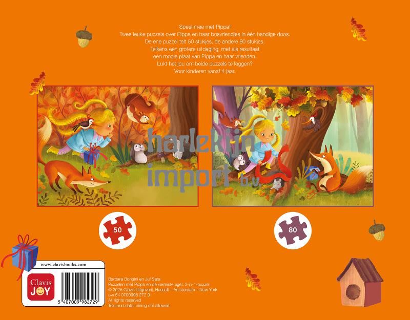 Speel mee met Pippa! Pippa en haar bosvriendjes in één handige doos. De ene puzzel telt 50 stukjes, de andere 80 stukjes. Telkens een grotere uitdaging, met als resultaat een mooie plaat van Pippa en haar vrienden. Lukt het jou om beide puzzels te leggen? Voor kinderen vanaf 4 jaar.