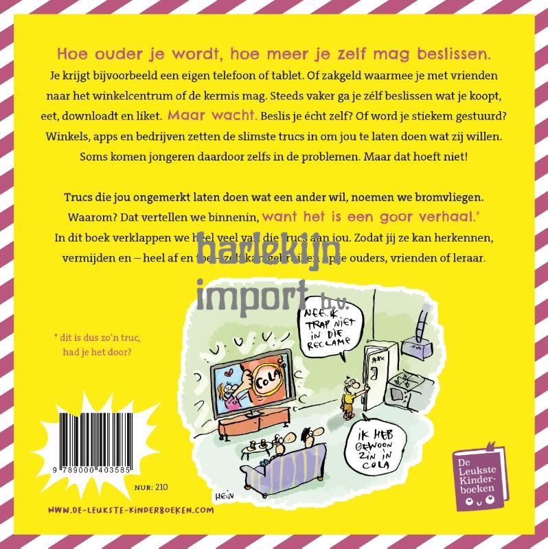 Junior-editie van het succesvolle Het bromvliegeffect Wist je dat de afbeelding van één piepklein vliegje jaarlijks duizenden euro’s aan schoonmaakkosten kan schelen? Als iets schijnbaar kleins ongemerkt grote invloed heeft op ons gedrag heet dat het bromvliegeffect. En dat effect zie je de hele dag door overal om ons heen – maar alleen als je weet waar je op moet letten! Je wordt ouder en mag steeds meer zelf beslissen. Maar kies je écht zelf of word je stiekem gestuurd in deze wereld vol apps, influencers en reclame? In Het bromvliegeffect junior leren gedragswetenschapper Eva van den Broek en reclamestrateeg Tim den Heijer kinderen om het bromvliegeffect te herkennen, de negatieve invloed ervan te vermijden en het op een goede manier zelf te gebruiken. Op school, in de winkel, op straat, online én thuis. In Het bromvliegeffect junior leer je aan de hand van de zeven bromvliegen hoe piepkleine dingen de hele dag bepalen wat jij doet – en hoe jij kunt bepalen wat jouw ouders doen! Met hilarische illustraties en cartoons van familie De Kort. Geschikt om zelf te lezen vanaf 8 jaar.