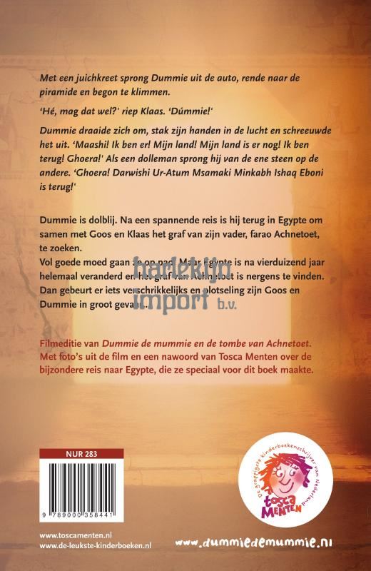 Met een juichkreet sprong Dummie uit de auto, rende naar de piramide en begon te klimmen. 'Hé, mag dat wel?' riep Klaas. 'Dúmmie!' Dummie draaide zich om, stak zijn handen in de lucht en schreeuwde het uit. 'Maashi! Ik ben er! Mijn land! Mijn land is er nog! Ik ben terug! Ghoera!' Als een dolleman sprong hij van de ene steen op de andere. 'Ghoera! Darwishi Ur-Atum Msamaki Minkabh Ishaq Eboni is terug!' Dummie is dolblij. Na een spannende reis is hij terug in Egypte om samen met Goos en Klaas het graf van zijn vader, farao Achnetoet, te zoeken. Vol goede moed gaan ze op pad. Maar Egypte is na vierduizend jaar helemaal veranderd en het graf van Achnetoet is nergens te vinden. Dan gebeurt er iets verschrikkelijks en plotseling zijn Goos en Dummie in groot gevaar… Alweer een komisch, ontroerend, maar vooral spannend verhaal over Dummie de mummie. Tosca Menten ging speciaal voor dit boek op reis naar Egypte.