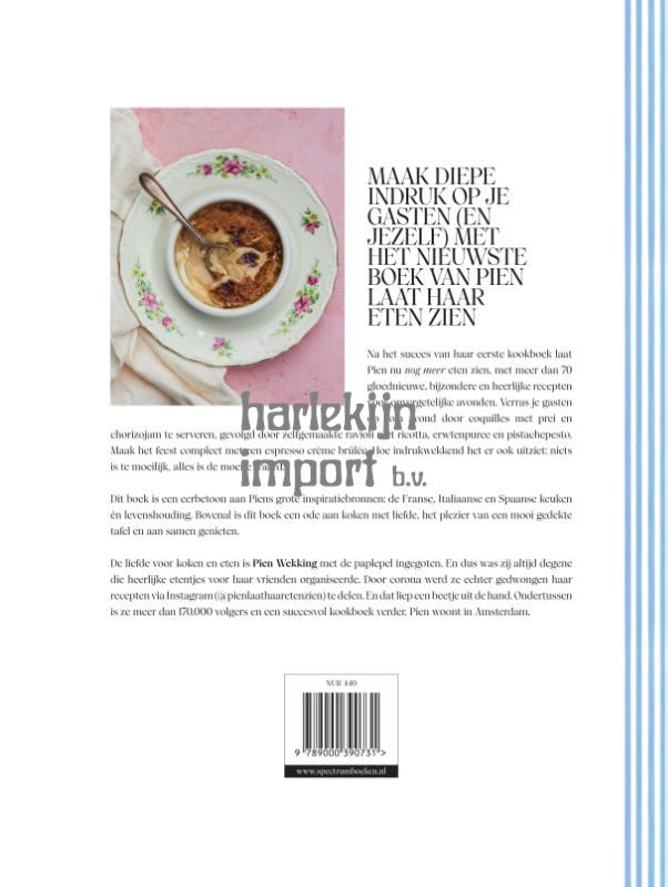 Onvergetelijke avonden met het nieuwste kookboek van Pien laat haar eten zien van Pien laat haar eten zien en Pien laat haar eten zien vol. 2 zijn samen al meer dan 72.500 exemplaren verkocht! Na het succes van haar eerste kookboek laat Pien nu nog meer eten zien, met meer dan 70 gloednieuwe, bijzondere en de allerlekkerste recepten voor onvergetelijke avonden. Verras je gasten op zo’n avond door gamba's en inktvis in pittige saus te serveren, gevolgd door zelfgemaakte ravioli met ricotta, erwtenpuree en pistachepesto. Maak het feest compleet met een espresso crème brûlée. Hoe indrukwekkend het ook klinkt en eruit ziet: niets is te moeilijk, alles is de moeite waard. Dit boek is een eerbetoon aan Piens grote inspiratiebronnen: de Franse, Italiaanse en Spaanse keuken én levenshouding. Bovenal is dit boek een ode aan koken met liefde, het plezier van een mooi gedekte tafel en aan samen genieten. De liefde voor koken en eten is Pien Wekking met de paplepel ingegoten. En dus was zij altijd degene die heerlijke etentjes voor haar vrienden organiseerde. Door corona werd ze echter gedwongen haar recepten via Instagram (@pienlaathaaretenzien) te delen. En dat liep een beetje uit de hand. Ondertussen is ze meer dan 170.000 volgers en een succesvol kookboek verder. Pien woont in Amsterdam.