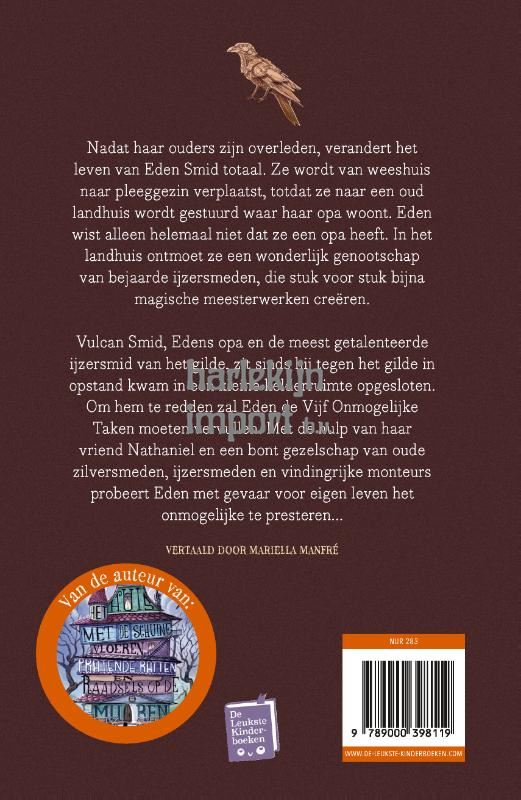 Een nieuw avontuur van de auteur van Het huis met de schuine vloeren Nadat haar ouders zijn overleden, verandert het leven van Eden Smid totaal. Ze wordt van weeshuis naar pleeggezin verplaatst, totdat ze naar een oud landhuis wordt gestuurd waar haar opa woont. Eden wist alleen helemaal niet dat ze een opa heeft. In het landhuis ontmoet ze een wonderlijk genootschap van bejaarde ijzersmeden, die stuk voor stuk bijna magische meesterwerken creëren. Vulcan Smid, Edens opa en de meest getalenteerde ijzersmid van het gilde, zit sinds hij tegen het gilde in opstand kwam in een kleine kelderruimte opgesloten. Om hem te redden zal Eden de Vijf Onmogelijke Taken moeten vervullen. Met de hulp van haar vriend Nathaniel en een bont gezelschap van oude zilversmeden, ijzersmeden en vindingrijke monteurs probeert Eden met gevaar voor eigen leven het onmogelijke te presteren... Een fantastisch nieuw avontuur in een spectaculaire wereld vol bizarre uitvindingen en zonderlinge personages