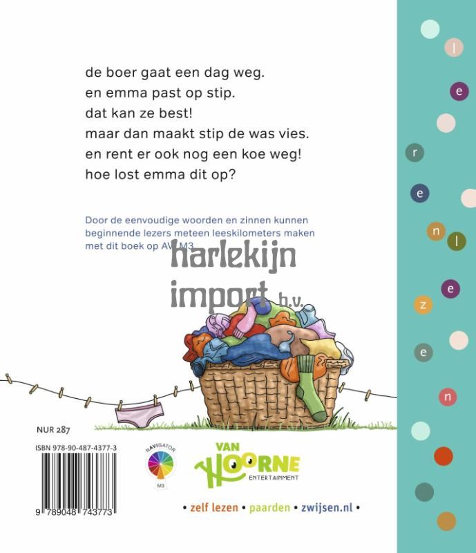 Grappig boek over de lieve pony Stip. Nou ja, lief … Hij maakt de was vies. Hoe lost Emma dat nou weer op? Lees het hele avontuur in dit boek op AVI M3, dus voor kinderen van 6-7 jaar om zelf te lezen. Dat is nog eens leuk leeskilometers maken.