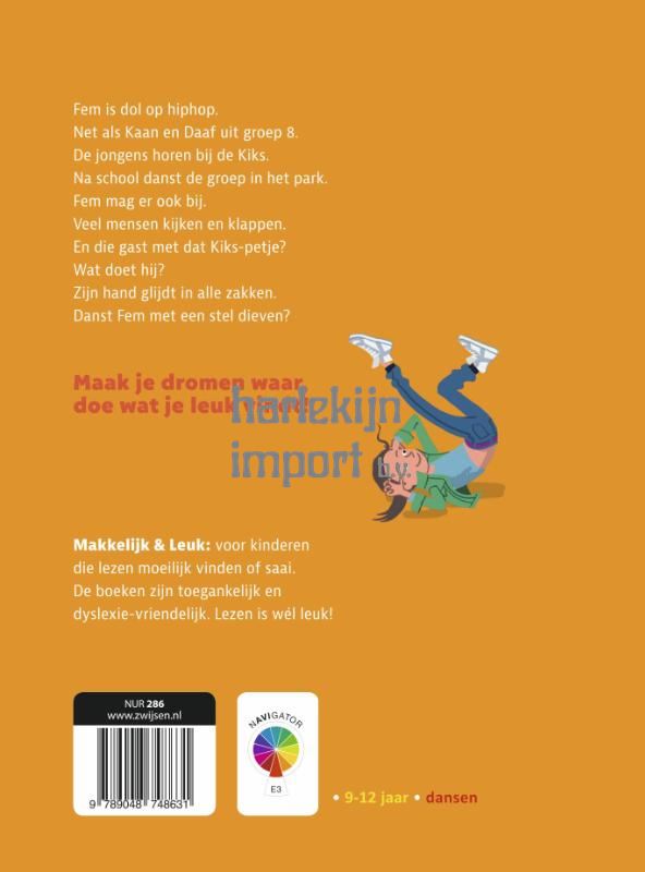 Fem danst de hele dag en is gek op hiphop. Dan mag ze meedansen met de Kiks, een hiphopgroep die na schooltijd in het park danst. Fem voelt zich geweldig, totdat haar vriendin haar vertelt dat er iets niet klopt in de groep. Danst Fem met dieven of is er iets anders aan de hand? Aansprekend verhaal op laag AVI-niveau (AVI E3) voor kinderen van 9 tot 12 jaar. De serie ‘Makkelijk & Leuk’ is speciaal gemaakt voor kinderen die lezen moeilijk vinden of saai. Zo krijgen zij weer plezier in lezen. Dyslexievriendelijk! Fem is dol op hiphop. Kaan en Daaf uit groep 8 ook. De jongens horen bij de Kiks. Na school danst de groep in het park. Fem mag er ook bij. Veel mensen kijken en klappen. En die gast met dat Kiks-petje? Wat doet hij? Zijn hand glijdt in alle zakken. Danst Fem met een stel dieven?
