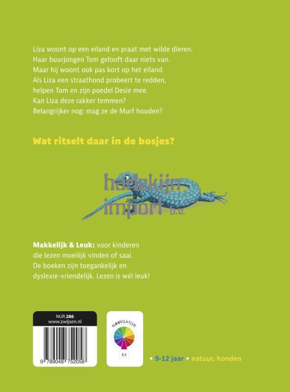 Felies praat met wilde dieren, zegt ze. Haar buurjongen Tomas gelooft daar niks van. Maar hij woont ook pas kort op het eiland. Als Felies een straathond probeert te redden, helpen Tomas en zijn poedel mee. Kan Felies deze rakker wel temmen? Belangrijker nog: mag ze de Murf?houden? Haar ouders willen geen wilde dieren in huis. Zelfs niet eentje die Murf heet. Met dieren praten, dat is leuk! Dat vind Felies ook, maar haar buurjongen Tomas gelooft er niets van. Toch gaat hij met haar mee op avontuur. Ook een dierenvriend thuis? Murf is een verhaal op AVI E4-niveau van Liliana Erasmus, speciaal voor kinderen tussen de 9 en 12 die lezen moeilijk vinden. Want lezen wordt pas echt leuk als het verhaal over een onderwerp gaat dat jij leuk vindt. De ‘Makkelijk en Leuk’ serie bevat boeken over aansprekende thema’s in eenvoudige taal. Heb je de kleurrijke illustraties van ivan & ilia al gezien? Op naar veel leesplezier!