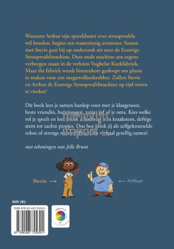 Wanneer Arthur zijn spreekbeurt over stroopwafels wil houden, begint een waanzinnig avontuur. Samen met Stevie gaat hij op onderzoek uit naar de Eeuwige Stroopwafelmachine. Deze oude machine zou ergens verborgen staan in de verlaten Vughelse Koekfabriek. Maar die fabriek wordt binnenkort gesloopt om plaats te maken voor een megawolkenkrabber. Zullen Stevie en Arthur de Eeuwige Stroopwafelmachine op tijd weten te vinden? Dit boek lees je samen hardop voor met je klasgenoot, beste vriendin, buurjongen, zusje, juf of je oma. Kies welke rol je speelt en leef je uit. Alles mag! Van kraakstem, deftige stem tot zachte piepjes. Dus hoe klink jij als je een zelfgeknutselde robot of als een strenge rechter? Beleef dit verhaal gezellig samen!