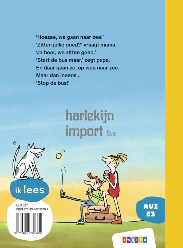 ‘Hoezee, we gaan naar zee!’ ‘Zitten jullie goed?’ vraagt mama. ‘Ja hoor, we zitten goed.’ ‘Start de bus maar,’ zegt papa. En daar gaan ze, op weg naar zee. Maar dan ineens … ‘Stop de bus!’ Het is druk in de bus! Iedereen wil met papa en mama mee naar zee. Linn en Finn gaanmee. En opa en oma en oom Ben. En natuurlijk Kat Pluisje en hond Bullie. Maar dan ineens … moeten ze stoppen. En nog een keer. En nog eens. Wat is er aan de hand? Dat lezen leuk is, bewijst dit avontuurlijke boek uit de serie ik lees op AVI E3. Beginnende lezers genieten van dit vrolijke verhaal over een verrassend uitje.