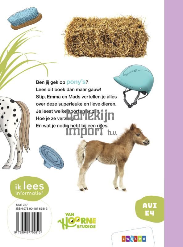 Ben jij gek op pony’s? Lees dit boek dan maar gauw! Stip, Emma en Mads vertellen je alles over deze superleuke en lieve dieren. Je leest welke soorten er zijn. Hoe je ze verzorgt. En wat je nodig hebt bij een rijles. Emma rijdt graag op Stip. Maar ze vindt het net zo leuk om hem te verzorgen! Haar vriend Mads helpt haar daarbij. Samen weten ze veel over pony’s en paarden. Welke soorten er zijn, hoe je met de viervoeters omgaat, hoe je ze verzorgt, en wat je allemaal nodig hebt voor rijles … Sla dit leerzame boek open en je komt erachter! Beginnende lezers met een hart voor pony’s en paarden kunnen dit interessante boek op AVI E4-niveau maar moeilijk wegleggen. Dankzij de interessante voorbeelden, verrassende weetjes en grappige moppen en raadsels weten ze straks alles over deze edele dieren. Naast de leerzame tekst staat dit boek ook nog eens vol met mooie foto’s en vrolijke tekeningen.