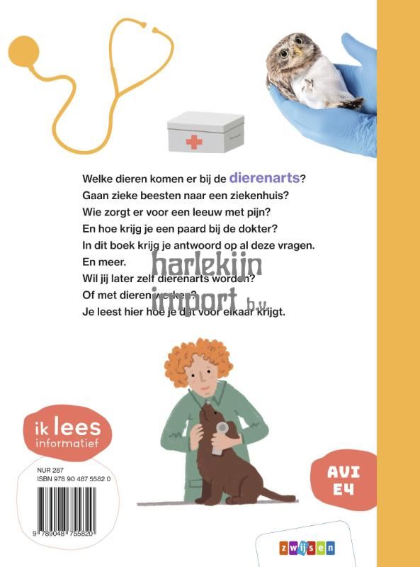 Welke dieren komen er bij de dierenarts? Gaan zieke beesten naar een ziekenhuis? Wie zorgt er voor een leeuw met pijn? En hoe krijg je een paard bij de dokter? In dit boek krijg je antwoord op al deze vragen. En meer. Wil jij later zelf dierenarts worden? Of met dieren werken? Je leest hier hoe je dat voor elkaar krijgt. Ook een hond of kat wordt weleens ziek. Een paard kan zijn been ook breken en wie helpt een leeuw met kiespijn? Dat doet de dierenarts! In dit informatieve en origineel vormgegeven boek leer je alles over dit leuke beroep. Hoe ziet een dierenartsenpraktijk eruit? Welke dieren komen er allemaal bij de dierenarts? Je leest ook over Pup Bobbie die naar de dierenarts gaat. Waarom moet hij eigenlijk naar de dokter? Wat doet de dierenarts? is speciaal geschreven voor beginnende lezers die een huisdier hebben, van dieren houden óf later zelf misschien wel dierenarts willen worden. De leerzame tekst is aangevuld met mooie foto’s en kleurrijke illustraties.