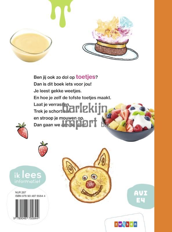 Ben jij ook zo dol op toetjes? Dan is dit boek iets voor jou! Je leest over gekke toet-weetjes. En hoe je zelf de tofste toetjes maakt. Laat je verrassen. Trek je schort aan en stroop je mouwen op. Dan gaan we aan de slag! Wat is jouw favoriete toetje? In dit vrolijke boek duiken beginnende lezers in de wereld van toetjes. Van ijs tot pannenkoek en van fruit tot kaas, er zijn veel verschillende soorten toetjes. Waar komen ze vandaan, welke soorten zijn er, en hoe maak je ze zelf? De kleurrijke illustraties, smakelijke foto’s, leuke weetjes én grappige moppen en raadsels nodigen uit tot lezen en ontdekken. Dit boek uit de serie ik lees informatief is speciaal geschreven op AVI E4-niveau voor kinderen die graag leeskilometers maken terwijl ze hun nieuwsgierigheid voeden.