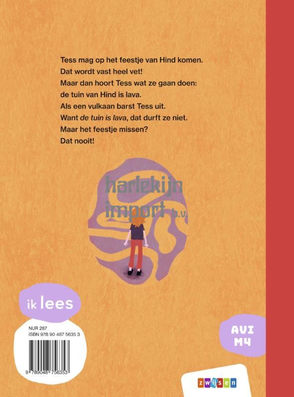 Tess mag op het feestje van Hind komen. Dat wordt vast heel vet! Maar dan hoort Tess wat ze gaan doen: de tuin van Hind is lava. Als een vulkaan barst Tess uit. Want de tuin is lava, dat durft ze niet. Maar het feestje missen? Dat nooit! Tess wilde zo graag naar het feestje van Hind. Maar als ze hoort wat ze gaan doen, krijgt ze een knoop in haar maag. De tuin is lava, dat vindt ze veel te eng. ‘Soms moet je iets doen, wat je niet durft,’ zei haar vader. Dus Tess gaat. Maar dan gebeurt precies waar ze bang voor was … Beginnende lezers genieten van het verrassende plot van dit leuke verhaal. Het boek maakt onderdeel uit van de serie ik lees op AVI M4.