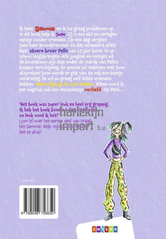 Ik heet Sammie en ik los graag problemen op. In dit boek help ik Juno, een stil en verlegen meisje zonder vrienden. Op een dag vergeet Juno haar broodtrommel. En dat verandert alles! Haar stoere broer Pelle van 13 jaar komt de vergeten trommel op school langsbrengen. Alle jongens én meisjes uit de bovenbouw zijn diep onder de indruk van Pelles knappe verschijning. En opeens wil iedereen met Juno afspreken! Juno wordt er gek van. En ook een beetje verdrietig. Ze wil zo graag zelf échte vrienden hebben. Natuurlijk ga ik Juno helpen. Alleen word ik per ongeluk ook een ietsepietsje verliefd. Op Pelle … Sammie woont met haar vrienden en oudste broer in De oude school. Daar wonen ook hun ouders, maar de bovenverdieping is helemaal voor de kinderen, geen ouder valt ze daar lastig. Sammie lost graag problemen op en in dit boek heeft Juno een probleem, iedereen is verliefd op haar broer Pelle en willen met haar omgaan omdat ze een toffe broer heeft. Tijd voor actie dus, het probleem van Juno moet opgelost worden! De hilarische situaties volgen elkaar in hoog tempo op in dit superleuke boek van Elisa van Spronsen. De vele grappige illustraties van Marja Meijer maken de leeservaring compleet. Genieten dus, voor kinderen van 9 jaar en ouder. Meer boeken op komst!