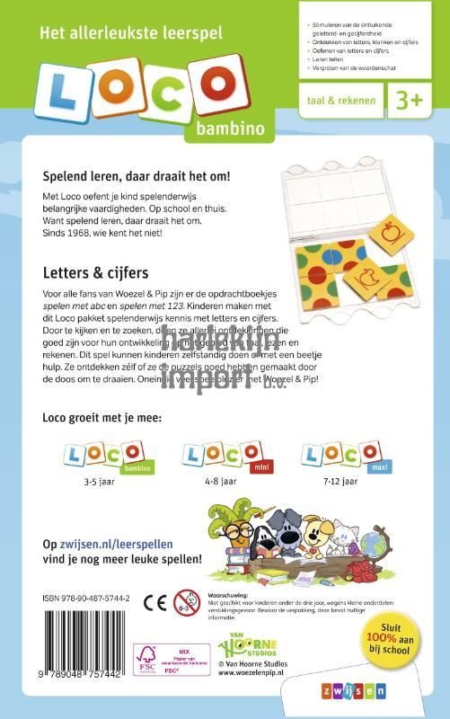 Kinderen maken met dit kleurrijke Loco pakket spelenderwijs kennis met letters en cijfers. Door te kijken en te zoeken doen ze allerlei ontdekkingen die goed zijn voor hun ontwikkeling op het gebied van taal, lezen en rekenen. Dit spel kunnen kinderen zelfstandig doen of met een beetje hulp. Ze ontdekken zélf of ze de puzzels goed hebben gemaakt door de doos om te draaien. Oneindig veel speelplezier met Woezel & Pip! Inhoud: • Loco bambino basisdoos • Opdrachtboekje Woezel & Pip spelen met abc • Opdrachtboekje Woezel & Pip spelen met 123 Leerdoelen: • Stimuleren van de ontluikende geletterd- en gecijferdheid • Ontdekken van letters, klanken en cijfers • Oefenen van letters en cijfers • Leren tellen • Vergroten van de woordenschat Met het zelfcorrigerende Loco oefent je kind spelenderwijs belangrijke vaardigheden. Op school en thuis. Want spelend leren, daar draait het om. Sinds 1968, wie kent het niet!
