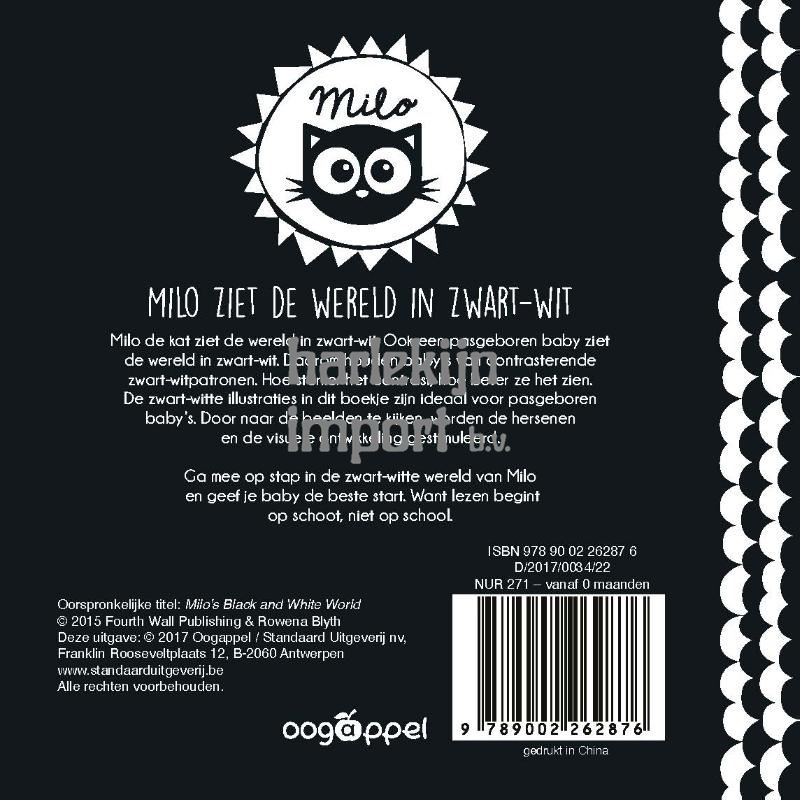 Milo de kat ziet de wereld in zwart-wit. Ook een pasgeboren baby ziet de wereld in zwart-wit. Daarom houden baby’s van contrasterende zwart-witpatronen. Hoe sterker het contrast, hoe beter ze het zien. De zwart-witte illustraties in dit boekje zijn ideaal voor pasgeboren baby’s. Door naar de beelden te kijken, worden de hersenen en de visuele ontwikkeling gestimuleerd. Ga mee op stap in de zwart-witte wereld van Milo en geef je baby de beste start. Want lezen begint op schoot, niet op school.