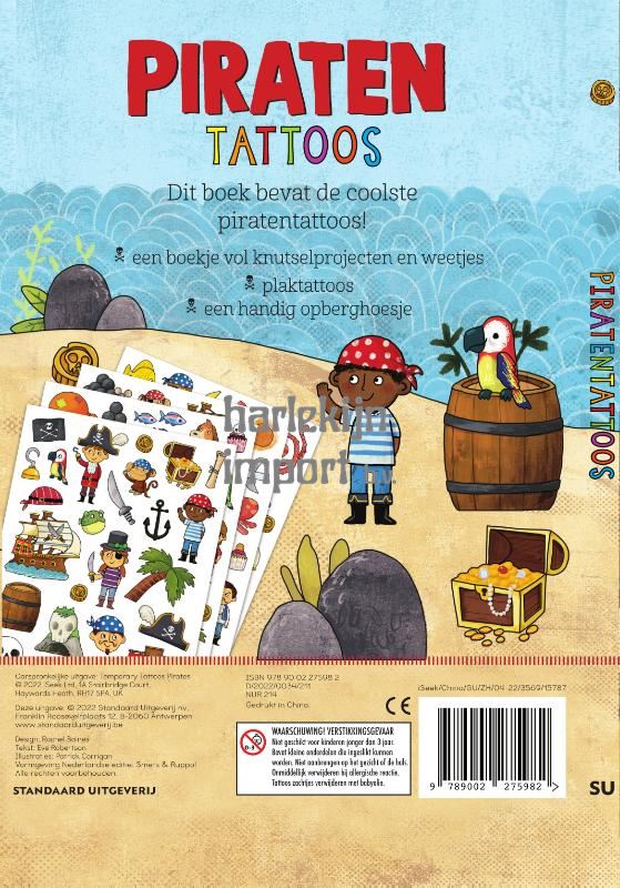 Meer dan 100 coole tattoos van piraten en hun wereld. De tattoos blijven enkele dagen op je huid zitten. Het boekje bevat ideeën om de tattoos op een andere manier te gebruiken. Je vindt er ook kleurprojecten, waanzinnige weetjes over piraten en een quiz in. Kleef ahoy! • een boekje vol knutselprojecten en weetjes • meer dan 100 plaktattoos • een handig opberghoesje