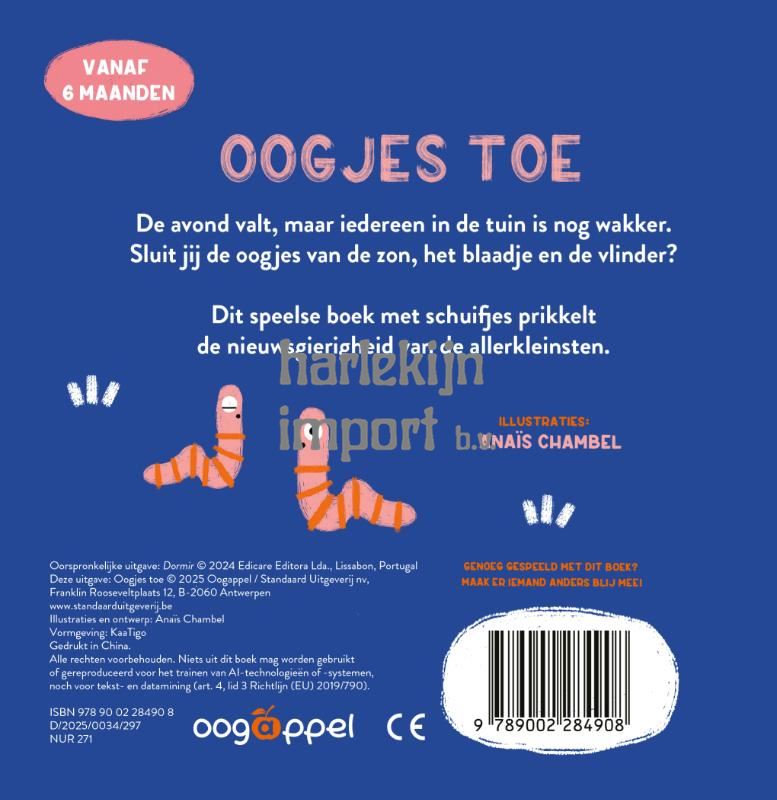 De avond valt, maar iedereen in de tuin is nog wakker.Sluit jij de oogjes van de zon, het blaadje en de vlinder? Dit speelse boek met schuifjes prikkelt de nieuwsgierigheid van de allerkleinsten.