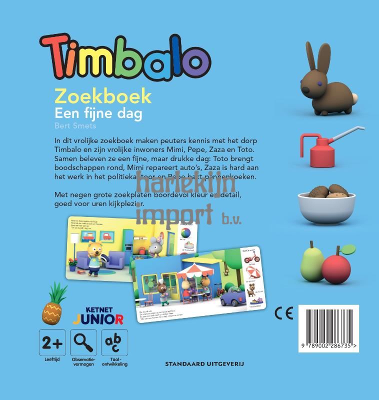 In dit vrolijke zoekboek maken peuters kennis met het dorp Timbalo en zijn vrolijke inwoners Mimi, Pepe, Zaza en Toto. Samen met hun vriendjes van het tv-programma beleven ze een fijne, maar drukke dag, waarin Toto boodschappen rondbrengt, Mimi auto's repareert, Zaza hard aan het werk is op het politiekantoor en Pepe pannenkoeken bakt. Met negen grote, gedetailleerde zoekplaten boordevol kleur en detail, goed voor uren kijkplezier.