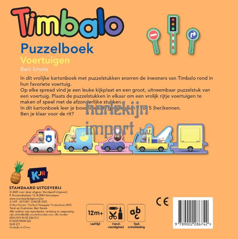 Vroem vroem... In dit vrolijke puzzelboek snorren de inwoners van Timbalo rond in hun favoriete voertuig. Op elke spread vind je naast een leuke kijkplaat ook een groot, uitneembaar puzzelstuk in de vorm van een politiewagen, een takelwagen, een sportauto en nog veel meer. Je kunt de puzzelstukken terug in het boek plaatsen, maar je kunt ze ook aan elkaar vastmaken om een vrolijke rij voertuigen te vormen. Daarbovenop wordt ook een aanzet gegeven tot het leren tellen van 1 tot 5.