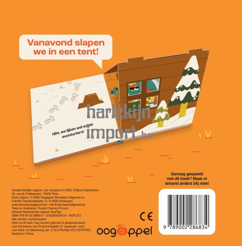 Acht tenten om zelf op te zetten, acht fantasiewerelden om in weg te dromen. Dit originele boek tilt het bedtijdritueel naar een heel nieuw niveau. De twee hoofdpersonages mogen voor het eerst een Canadese tent opzetten in de tuin van hun grootouders. Maar wanneer het tijd is om te gaan slapen, slaat hun fantasie op hol. Ze kruipen beurtelings in de huid van astronauten, avonturiers of archeologen en stellen zo het geduld van opa op de proef. Dankzij een slim systeem met flapjes kan de lezer zelf acht verschillende tenten opzetten. Voor elke tent ontwierp illustrator Florent Chamiot-Poncet een unieke visuele wereld, die de lezers kunnen gebruiken als speelruimte. Het boek vangt de magie van eerste kampeeravonturen en de fantasie van kinderspeelhuisjes in een speelse interactieve leeservaring.