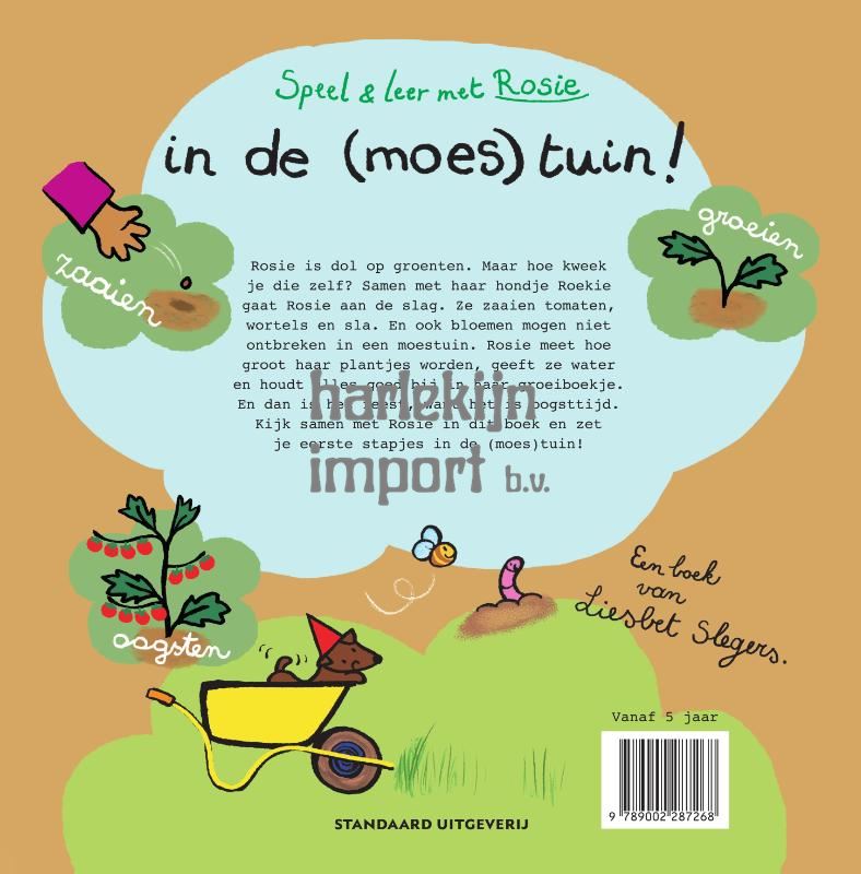 Rosie is dol op groenten. Maar hoe kweek je die zelf? Samen met haar hondje Roekie gaat Rosie aan de slag. Ze zaaien tomaten, wortels en sla. En ook bloemen mogen niet ontbreken in een moestuin. Rosie meet hoe groot haar plantjes worden, geeft ze water en houdt alles goed bij in haar groeiboekje. En dan is het feest, want het is oogsttijd. Kijk samen met Rosie in dit boek en zet je eerste stapjes in de (moes)tuin!