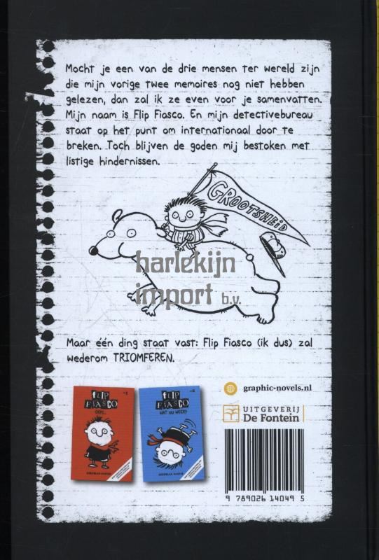 Ben jij een van de drie mensen ter wereld die mijn vorige boeken nog niet hebben gelezen? Dan vat ik ze even voor je samen: ik ben Flip Fiasco en mijn detectivebureau gaat internationaal doorbreken. Samen met mijn assistent-ijsbeer Fiks omzeil ik listige hindernissen en overwin ik elke tegenslag.