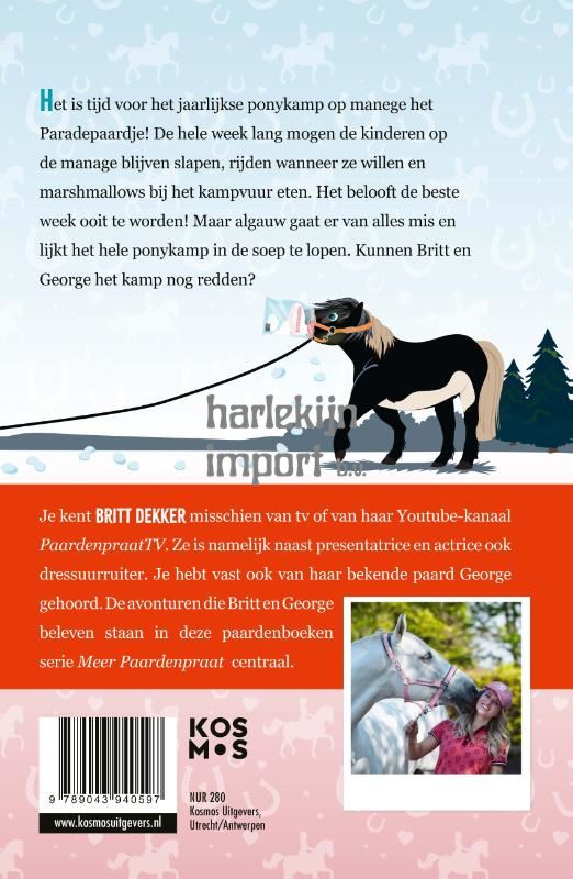 In ‘Ponykamp vol verrassingen’ van Britt Dekker gaan Britt en haar vrienden op ponykamp. De hele week lang mogen de kinderen op de manage blijven slapen, rijden wanneer ze willen en marshmallows bij het kampvuur eten. Het belooft de beste week ooit te worden! Maar algauw gaat er van alles mis en lijkt het hele ponykamp in de soep te lopen. Kunnen Britt en George het kamp nog redden? Dit boek is perfect voor jonge paardenfans die houden van avontuur en spanning! De uitvoering van dit (voorlees)boek is mooi gebonden en vrolijk geïllustreerd door Bianca van Loon. Dat maakt dit boek ook een perfect cadeau. Ter gelegenheid van een verjaardag, diploma, verhuizing, Sinterklaas, Kerstmis, of gewoon zomaar.
