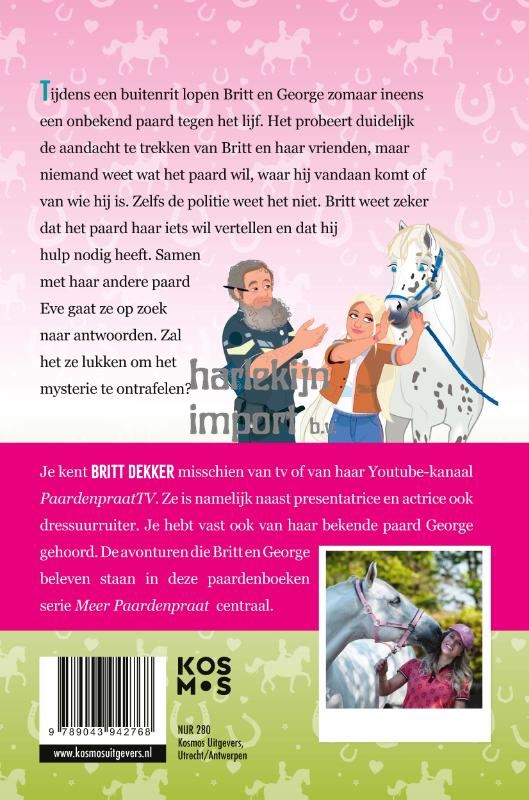 In ‘Een paard met een missie’ probeert een onbekend paard duidelijk de aandacht te trekken van Britt en haar vrienden, maar niemand weet wat het paard wil, waar hij vandaan komt of van wie hij is. Zelfs de politie weet het niet. Britt weet zeker dat het paard haar iets wil vertellen en dat hij hulp nodig heeft. Samen met George en Eve gaat ze op zoek naar antwoorden. Zal het hun lukken om het mysterie te ontrafelen? In de serie Meer Paardenpraat beleven Britt, Esra en Benthe-Sophie (bekend van Paardenpraat TV) allerlei spannende en grappige paardenavonturen. De uitvoering van dit (voorlees)boek is mooi gebonden en vrolijk geïllustreerd door Bianca van Loon. Dat maakt dit boek ook een perfect cadeau voor alle paardenfans. Ter gelegenheid van een verjaardag, diploma, verhuizing, Sinterklaas, Kerstmis, of gewoon zomaar.