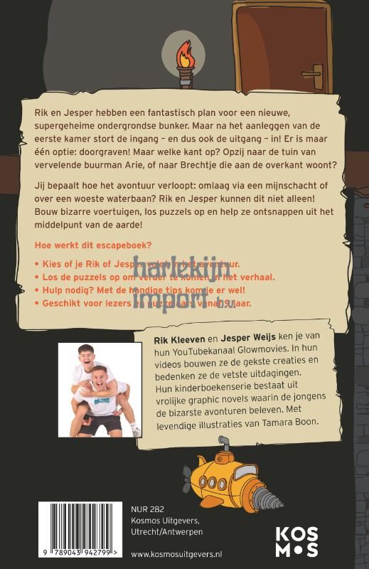 Rik en Jesper hebben een fantastisch plan voor een nieuwe, supergeheime ondergrondse bunker. Maar na het aanleggen van de eerste kamer stort de ingang – en dus ook de uitgang – in! Er is maar één optie: doorgraven! Maar welke kant op? Kies zelf de route: opzij naar de tuin van vervelende buurman Arie, of naar Brechtje die aan de overkant woont? Jouw keuze bepaalt hoe het avontuur van Rik en Jesper verloopt: omlaag via een mijnschacht of over een woeste waterbaan? Met een drilboorzandonderzeeër dwars door de aarde om zo hopelijk weer thuis te komen? Rik en Jesper kunnen dit niet alleen. Bouw bizarre voertuigen, los puzzels op en help de jongens ontsnappen uit het middelpunt van de aarde. Hoe werkt dit escapeboek? · Kies bij een aantal hoofdstukken of je mee gaat met Rik of met Jesper. · Los de puzzels op om verder te komen in het verhaal. · Hulp nodig? Met de handige tips kom je er wel!· Geschikt voor lezers en puzzelaars vanaf een jaar of negen. Rik Kleeven en Jesper Weijs ken je van hun YouTubekanaal Glowmovies. In hun videos bouwen ze de gekste creaties en bedenken ze de vetste uitdagingen. Hun kinderboekenserie bestaat uit vrolijke graphic novels waarin de jongens de bizarste avonturen beleven. Met illustraties van Tamara Boon.