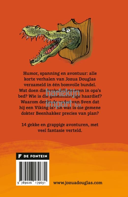 Alle korte verhalen van Jozua Douglas verzameld in één bomvolle avonturenbundel. Inclusief vier gloednieuwe verhalen. Wat doen die krokodilleneieren in opa’s bed? Waarom denkt de vader van Sven ineens dat hij een viking is? Wie is de geheimzinnige haardief? En wat is die valse chatbot van plan? 14 gekke en hilarische avonturen, met veel fantasie verteld.