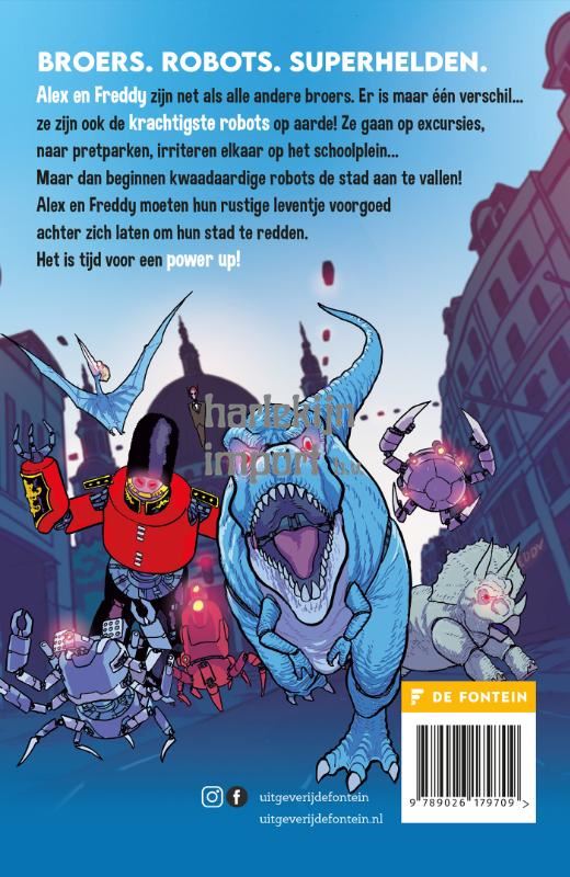 Broers. Robots. Superhelden. Alex en Freddy zijn net als alle andere broers. Er is maar één verschil… ze zijn ook de krachtigste robots op aarde! Maar de broers ontdekken al snel dat ze niet de enige megarobots zijn. Een kwaadaardige robot heeft een duister plan dat de hele stad in gevaar brengt. Alex en Freddy moeten hun rustige leventje voorgoed achter zich laten om hun stad te redden. Het is tijd voor een power-up! Nieuwe full-colour graphicnovelserie voor fans van Bunnie vs Monkie en Dogman, voor lezers vanaf 8 jaar.