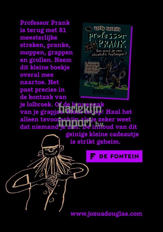 Na het succes van Professor Prank presenteert Jozua Douglas het langverwachte vervolg! Professor Prank is terug met 81 meesterlijke streken, pranks, moppen, grappen en grollen. Neem dit kleine boekje overal mee naartoe. Het past precies in de kontzak van je lolbroek. Of de binnenzak van je grapjas. Maar let op! Haal het alleen tevoorschijn als je zeker weet dat niemand je ziet. De inhoud van dit geinige kleinood is strikt geheim.