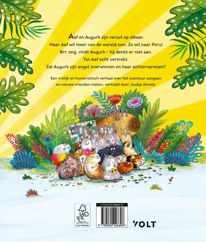 Wie gaat er mee op avontuur?De twee cavia’s Aaf en Augurk hebben hun hele leven samen in hetzelfde hok doorgebracht. Aaf staat te popelen om eropuit te gaan en de wereld te verkennen, maar Augurk is bang. Wat als ze geblesseerd raken of verdwalen? Maar Aaf laat zich niet afschrikken, en wanneer de mensen inpakken voor een reis naar Peru, grijpt ze haar kans om in hun bagage te kruipen en met ze mee te vliegen. Wat kan een verliefde Augurk anders doen dan achter haar aan gaan? Met een ritmische tekst op rijm en komische illustraties voeren Ross Montgomery en Sarah Warburton de lezer mee op een wilde reis die laat zien welke wonderen – waaronder nieuwe vrienden en een vrolijke capibara – aan de andere kant van de wereld te vinden zijn.