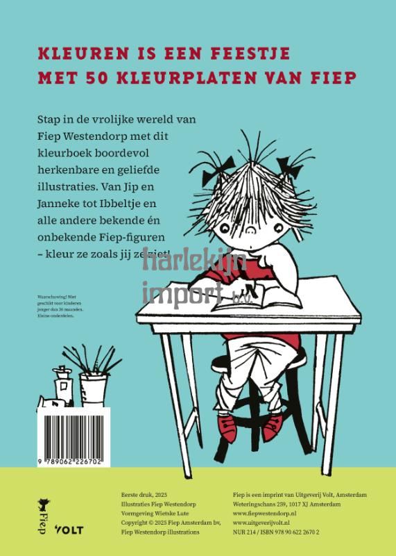 Laat je creativiteit sprankelen met het kleurboek van FiepStap in de vrolijke wereld van Fiep Westendorp met dit prachtige kleurboek boordevol herkenbare en geliefde illustraties. Van Jip en Janneke tot Pluk van de Petteflet en alle andere bekende én onbekende Fiep-figuren – kleur ze zoals jij ze ziet!Laat fantasie en kleur tot leven komen, Het grote Fiep Westendorp kleurboek is een ode aan tijdloze kinderverhalen.